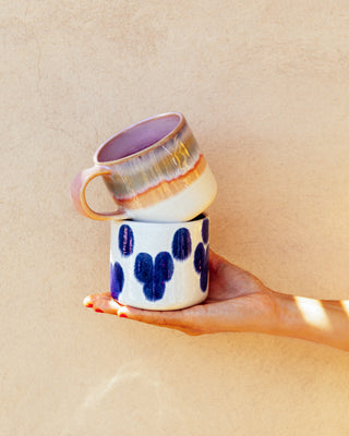 Starte deinen Tag mit einer Tasse Schokolade und unserer Nódoa Tasse! Mit dem Design und den blauen Punkten ist die gute Laune garantiert.
