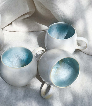 Keramikbecher mit rötlich-weißer Glasur auf weißem Hintergrund.Pinkfarbener Krug mit Blume, zwei Kerzenhalter und Schale mit orangem Dessert auf einem Buchdeckel im Sonnenlicht.